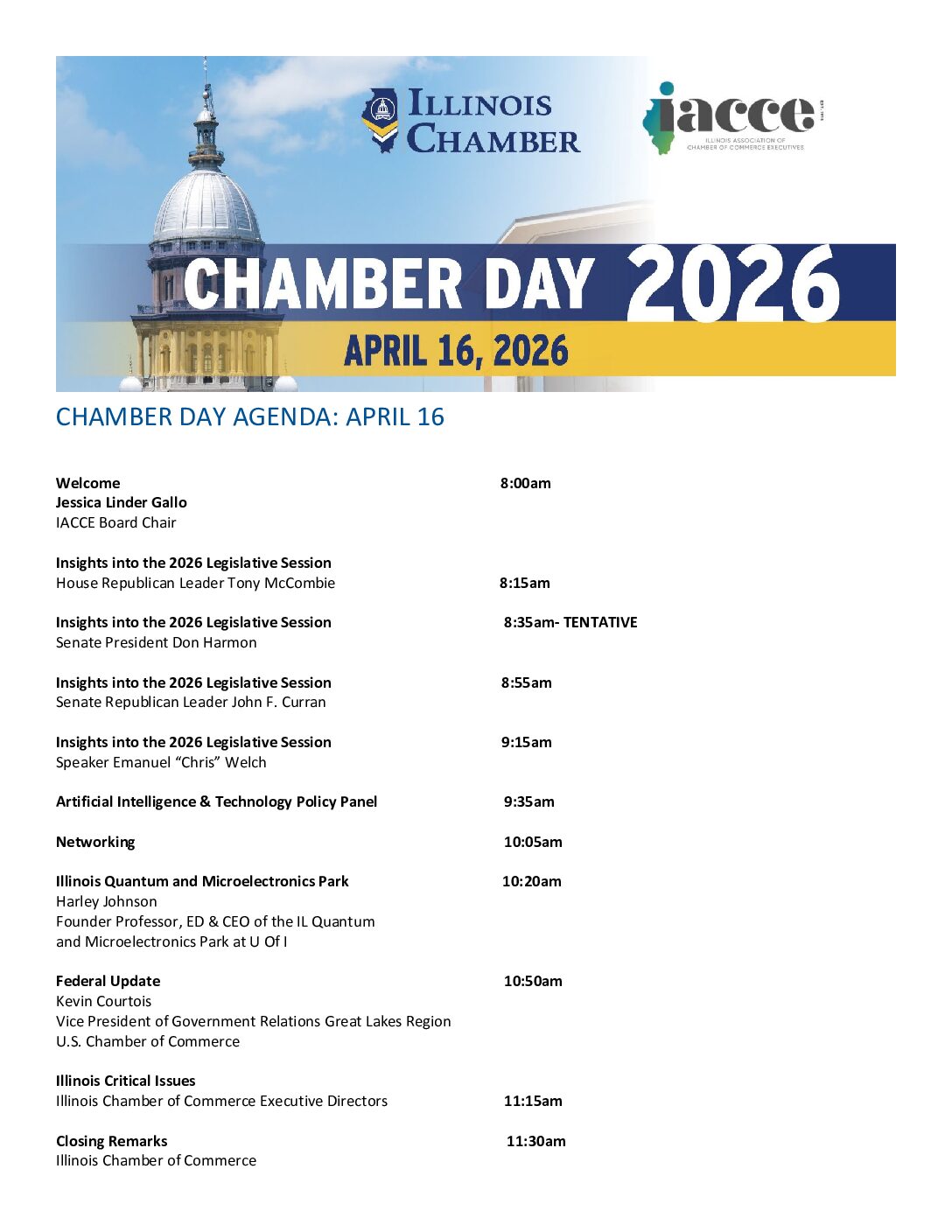 Founded in 1919, the Illinois Chamber of Commerce is an independent membership organization that fosters a Pro-Growth and Pro-Business climate for all Illinois businesses. The Chamber is supported by contributions from a diverse group of companies from across the state. Its membership reflects all components of Illinois’ economy, including manufacturing, financial services, transportation, technology, agriculture, mining, construction, utilities, and professional services, as well as other local chambers of commerce, trade groups, and membership organizations.