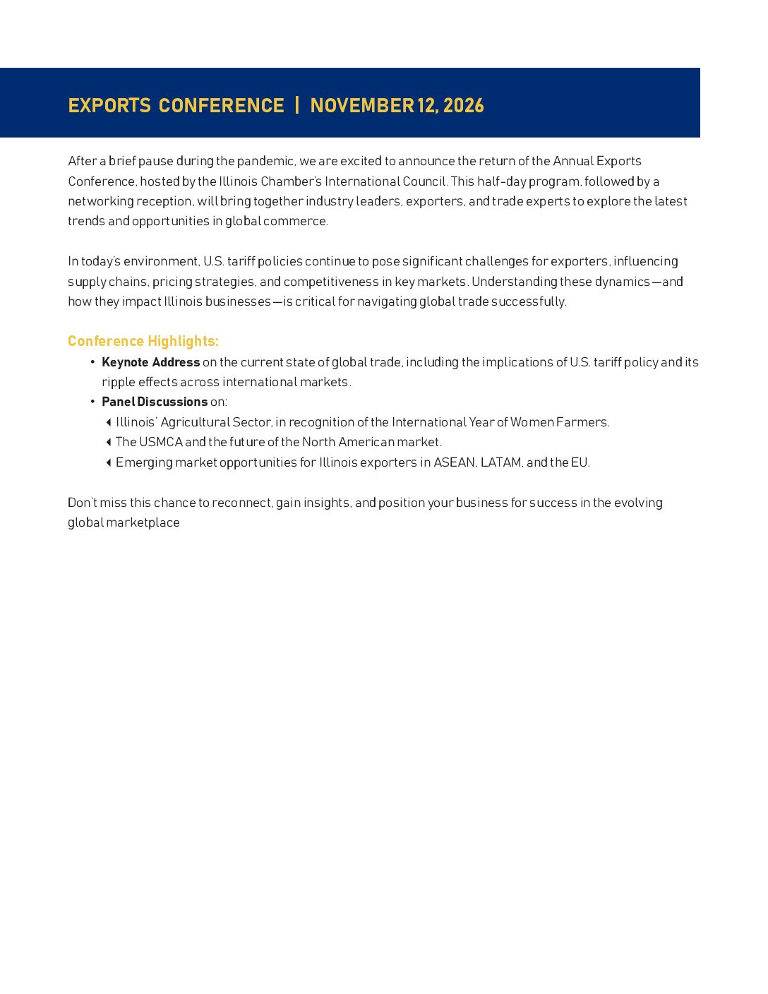 The Illinois Chamber works closely with its members to support their success and the growth of the Illinois economy through programming and advocacy that promotes and protects the business climate in Illinois and expands economic opportunities for all