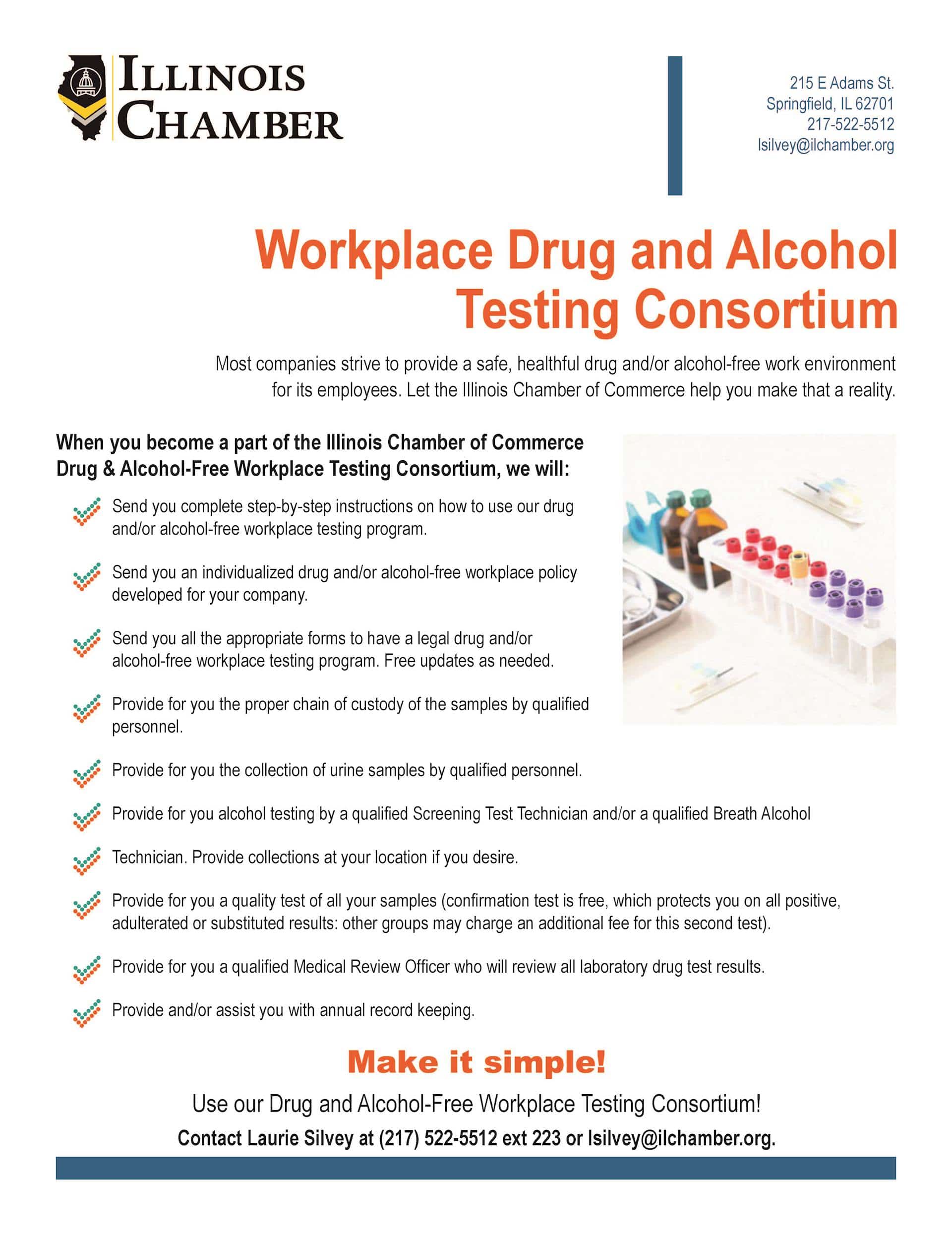 Drug and Alcohol Testing is an important element to keep workers and workplaces in the community safe. The Illinois Chamber of Commerce is partnering with Midwest Service Corporation to offer custom drug and alcohol testing in a way that best accommodates your needs. We can help you with reasonable suspicion training for your supervisors and managers as well as providing policies and the testing services you need. Contact us today to discuss your specific needs and answer your questions.