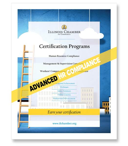 The Illinois Chamber of Commerce is offering compliance certification programs to recognize ongoing continuing education efforts and professional development in the areas of Human Resources Compliance, Workers’ Compensation and Safety Compliance and Management & Supervision Compliance.