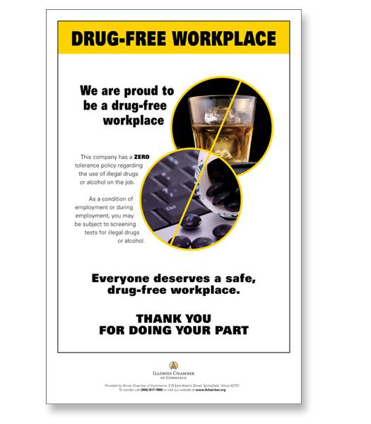 These signs can help to provide a drug-free work environment for your employees and may help protect from accidents, workers’ compensation claims and reduced productivity. This sign is laminated and measures 11? x 17?. This signage is recommended for all businesses and should be posted in all break rooms, locker rooms and employee restrooms. Discounts for quantity purchases – call (217) 522-5512 ext 227 for bulk pricing. Free shipping on this poster.